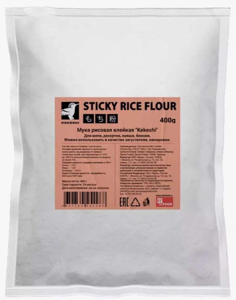 Мука рисовая клейкая KEKESHI — сухой продукт, изготовленный из клейкого риса (glutinous rice), предназначенный для использования в паназиатской кухне: десертов (например, «моти»), блинов, лапши, пирожков и других изделий с особой текстурой.